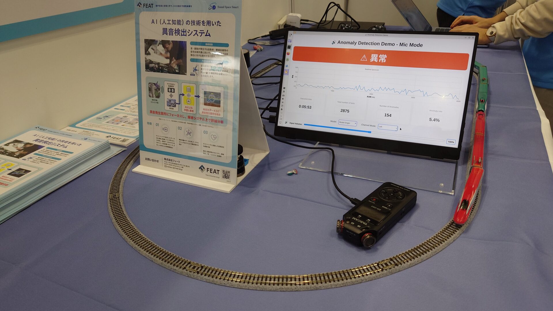 今回のデモ展示では、Nゲージを走らせて正常な模型の車両と車輪に異常がある車両を走行させてLinux端末と市販のマイクを用いたリアルタイムで異音が検出できることをご覧いただきました。