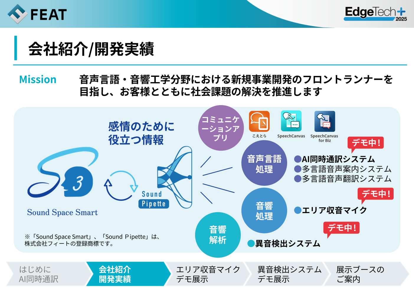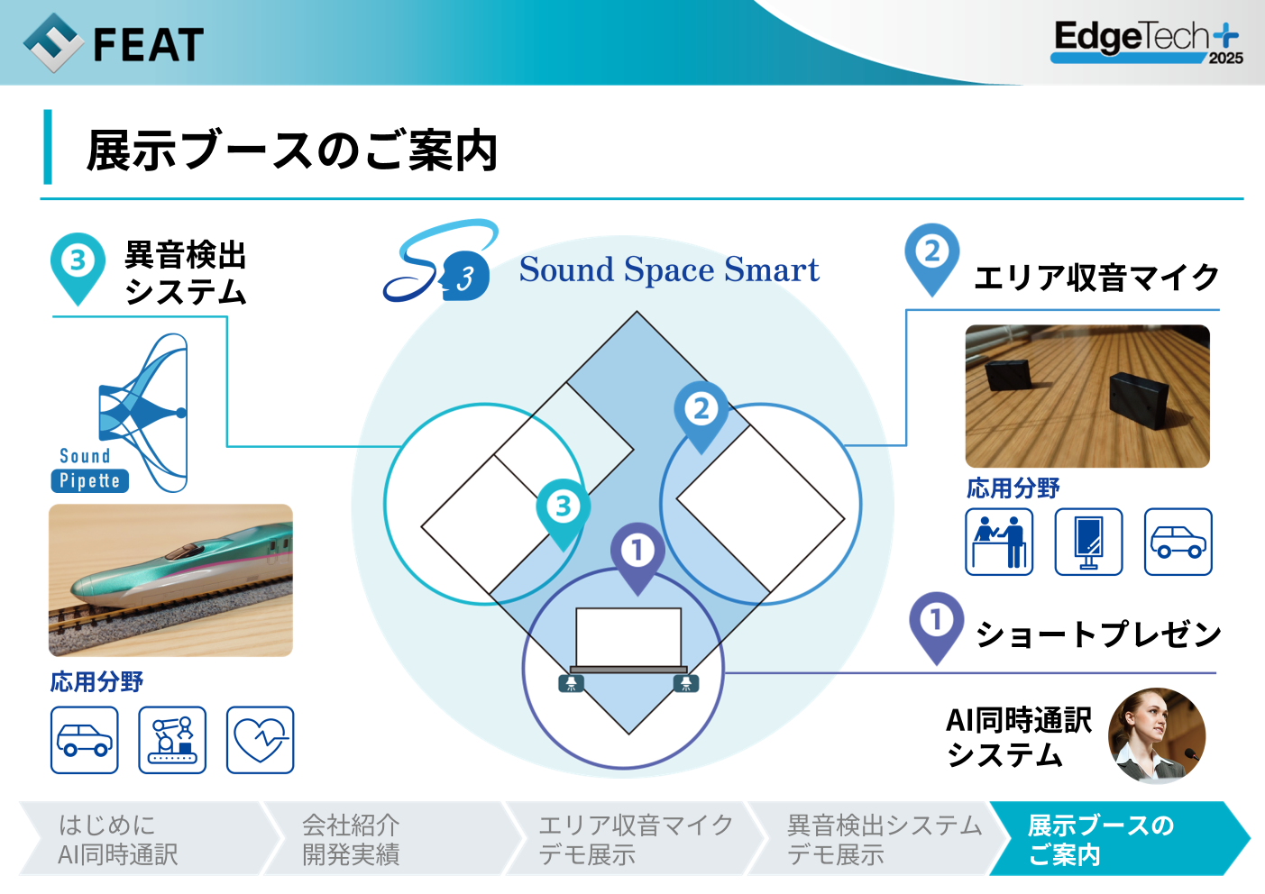 「EdgeTech+2025」では、「音声言語」と「音響工学」の技術で音響空間の機能性価値を創造する「Sound Space Smart®」をテーマに、「ココロ動かす感性体験」型デモを通じた3種類の先進的ソリューションをブースにてご紹介しました。